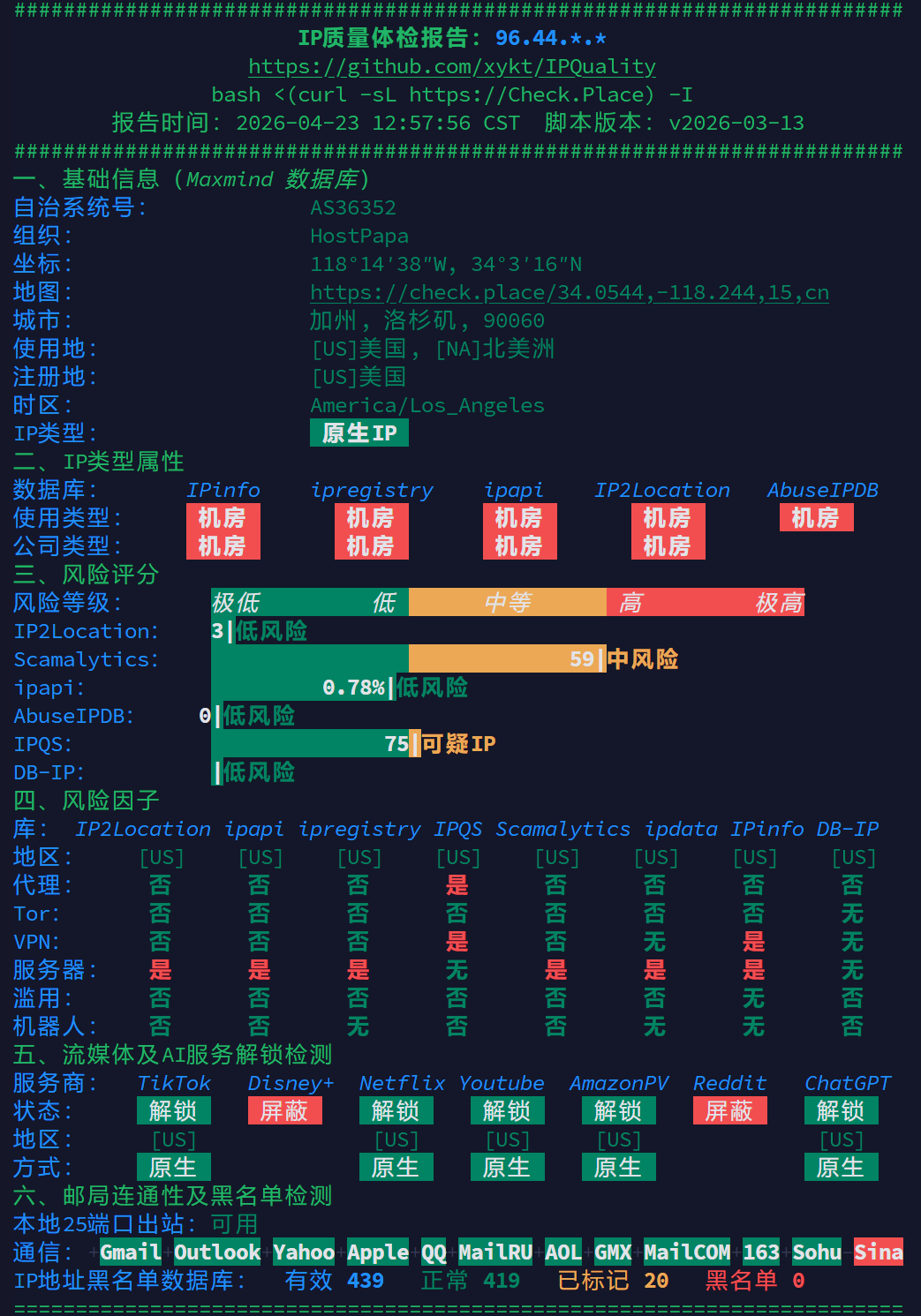 国家: US 城市: Los Angeles 服务商: AS36352 HostPapa